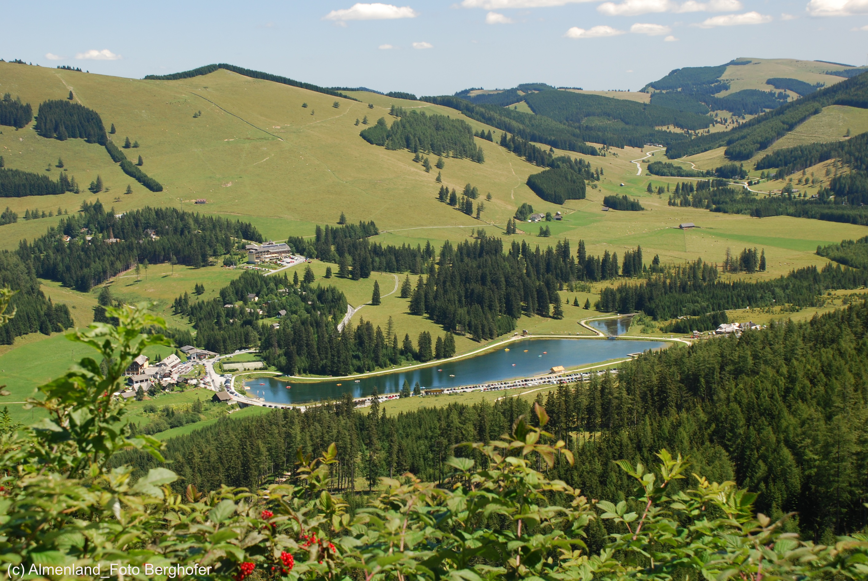 Was für ein Land, der Naturpark Almenland! Saftig-grüne Wiesen und dunkelgrüne Wälder auf sanften Hügeln. Dazwischen rote Tupfen: die Dächer der Bauernhäuser. Und in der Mitte, eingebettet in ein weites Hochplateau, der dunkelblaue Teichalmsee mit den bunten Tretboten. Rundherum auf den Weiden hellbraune und dunkelbraune Punkte, die ALMO-Ochsen, die delikates Rindfleisch liefern, das bei den Almenland-Genusswirten verkostet werden kann.